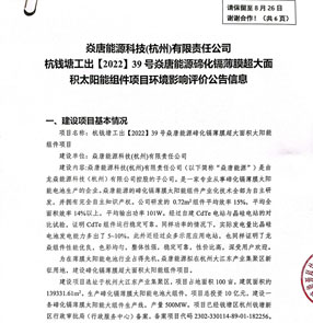 公告文件下载: 焱唐能源科技(杭州)有限责任公司杭钱塘工出【2022】39号焱唐能源碲化镉薄膜超大面积太阳能组件项目环境影响…